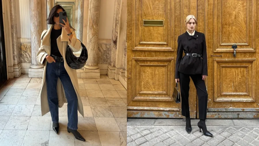 У 2025-му модниці все частіше відмовляються від човників або слингбеків на користь sock boots. Особливо ефектно вони виглядають у поєднанні з архітектурними чорними штанами.